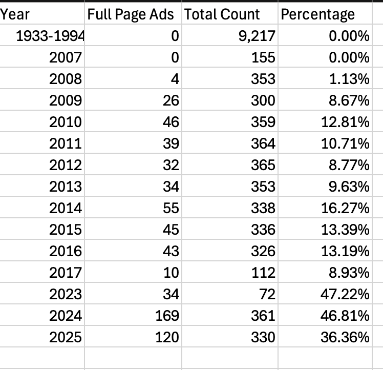 Another annoyance was full page ads. From 1932 to 1994, there were no full page ads on any of the front pages of The Indian Express. Starting around 2007, they begin to appear more frequently. Between 2009 and 2017, 11.57% of front pages had full page ads. That number jumps nearly fourfold to 42.33% of all front pages between 2023 and 2025. And this data doesn’t even include ads that covered 60-80% of the front page.
